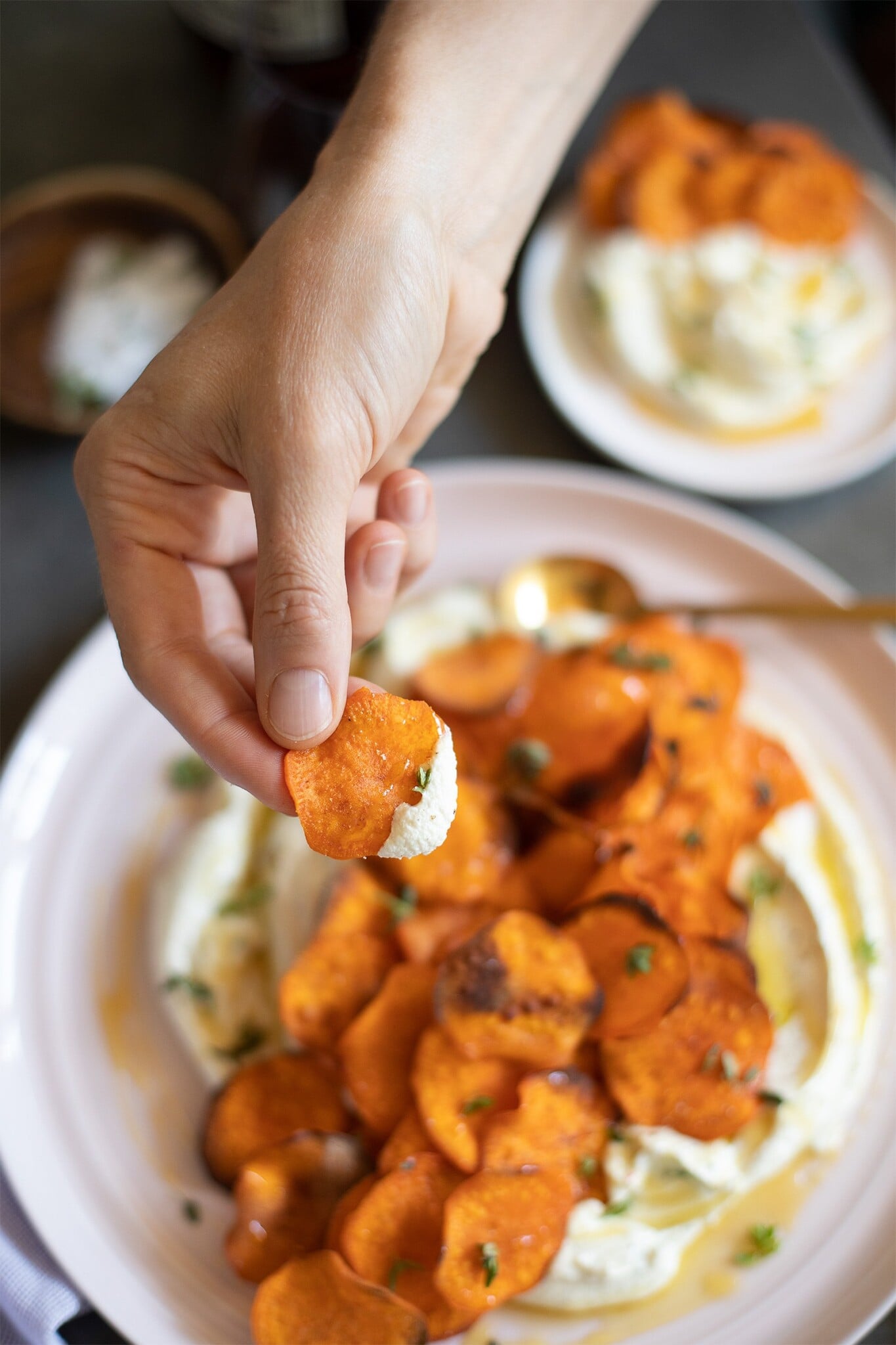 This Roasted Sweet Potato Chips with Whipped Goat Cheese appetizer is essentially crisp sweet potato chips scattered across whipped goat cheese. It may just sound like a healthy plant-based appetizer that’ll check the box for serving your vegetarian friends, but that is seriously discounting this recipe.