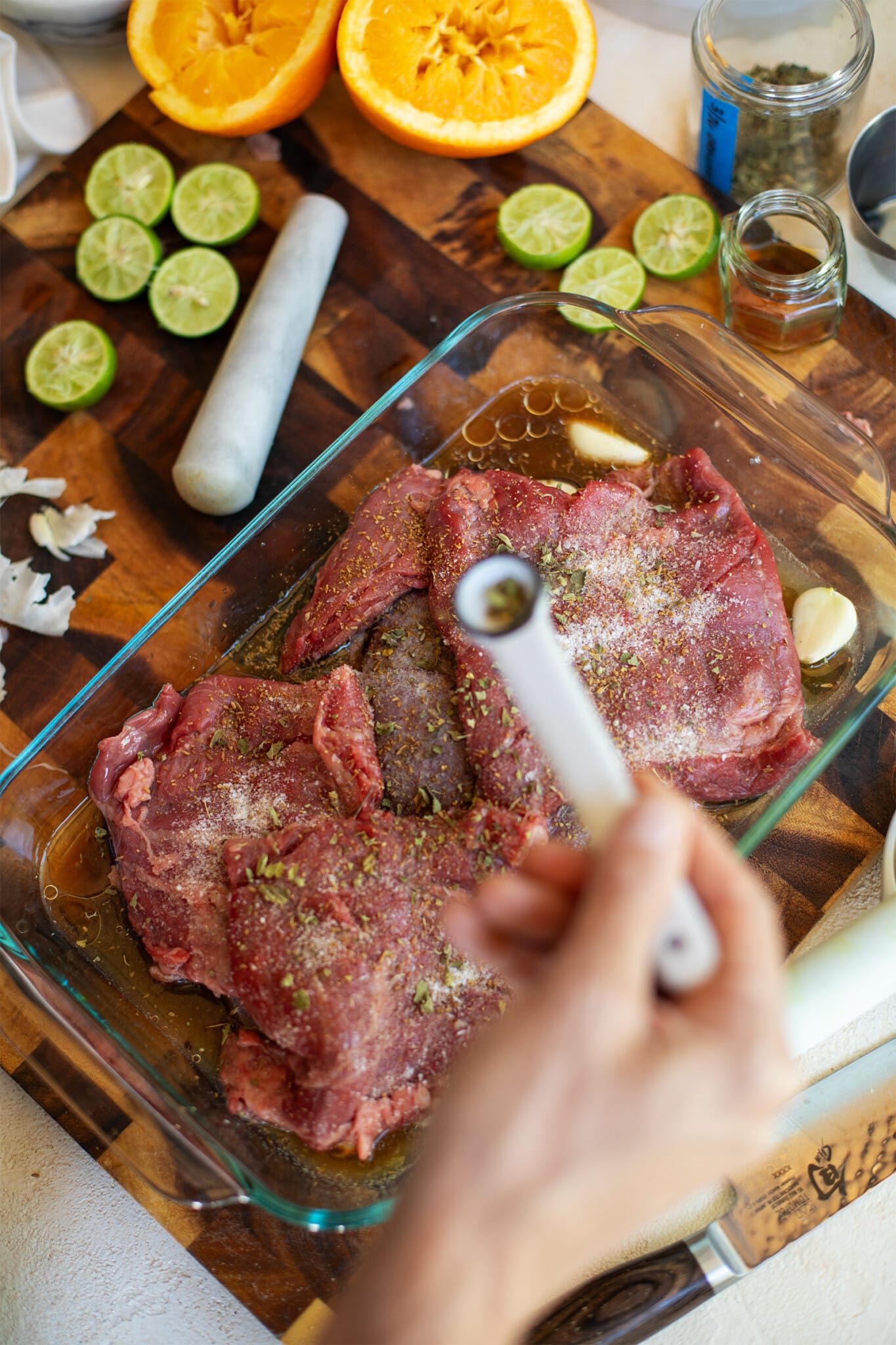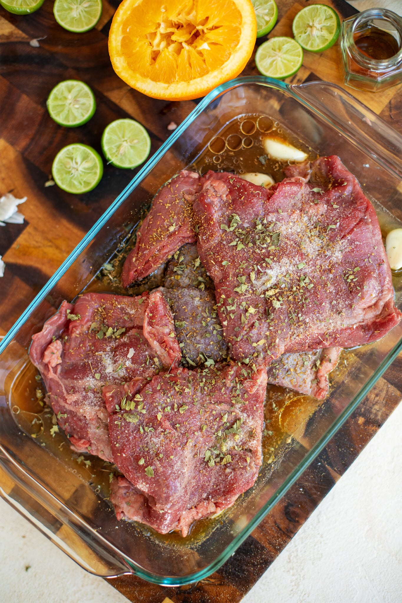 - Marinate the Carne Asada Meat: Slice the meat crosswise into pieces 6-inches long (this will help them fit better on the grill). Place the meat in a resealable plastic bag or a large nonreactive flat container (stainless steel or glass) and add orange juice, oil, lime juice, soy sauce, garlic, and spices. Turn to coat, and if using a resealable plastic bag, push out all the air and seal it. If using a container, cover itwell and place it in the refrigerator for at least 1 hour and a maximum of 24 hours.