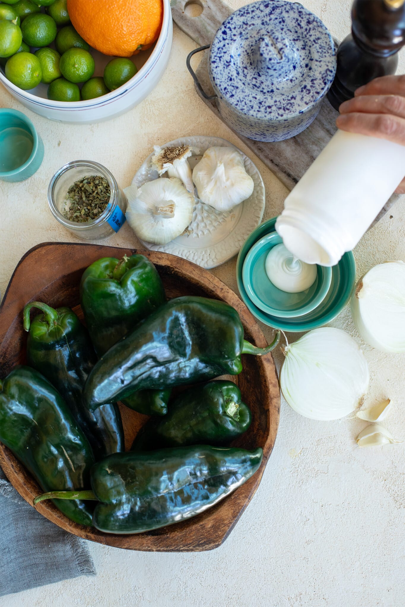 - 6 medium poblano peppers (sometimes labeled pasilla)
