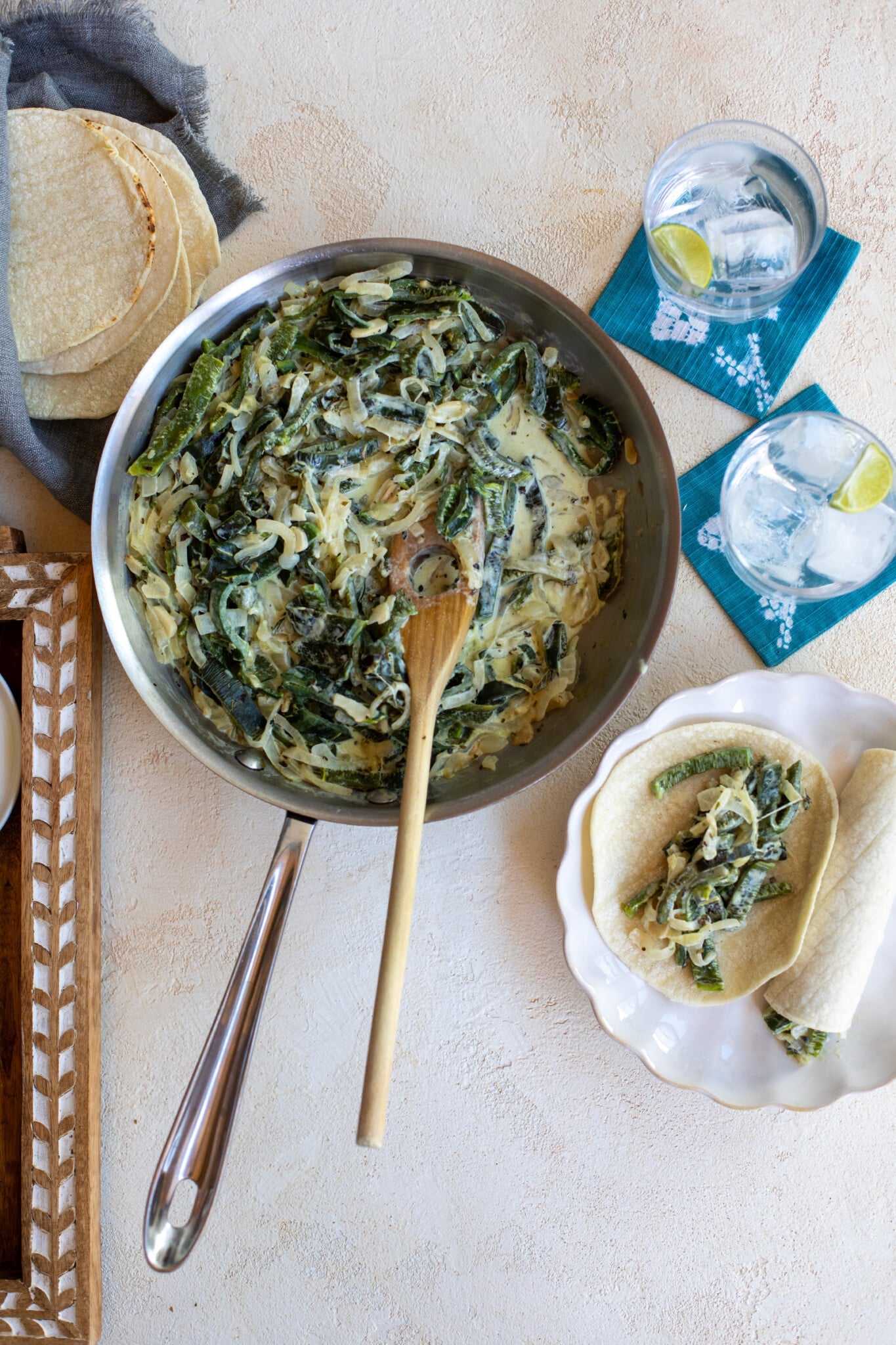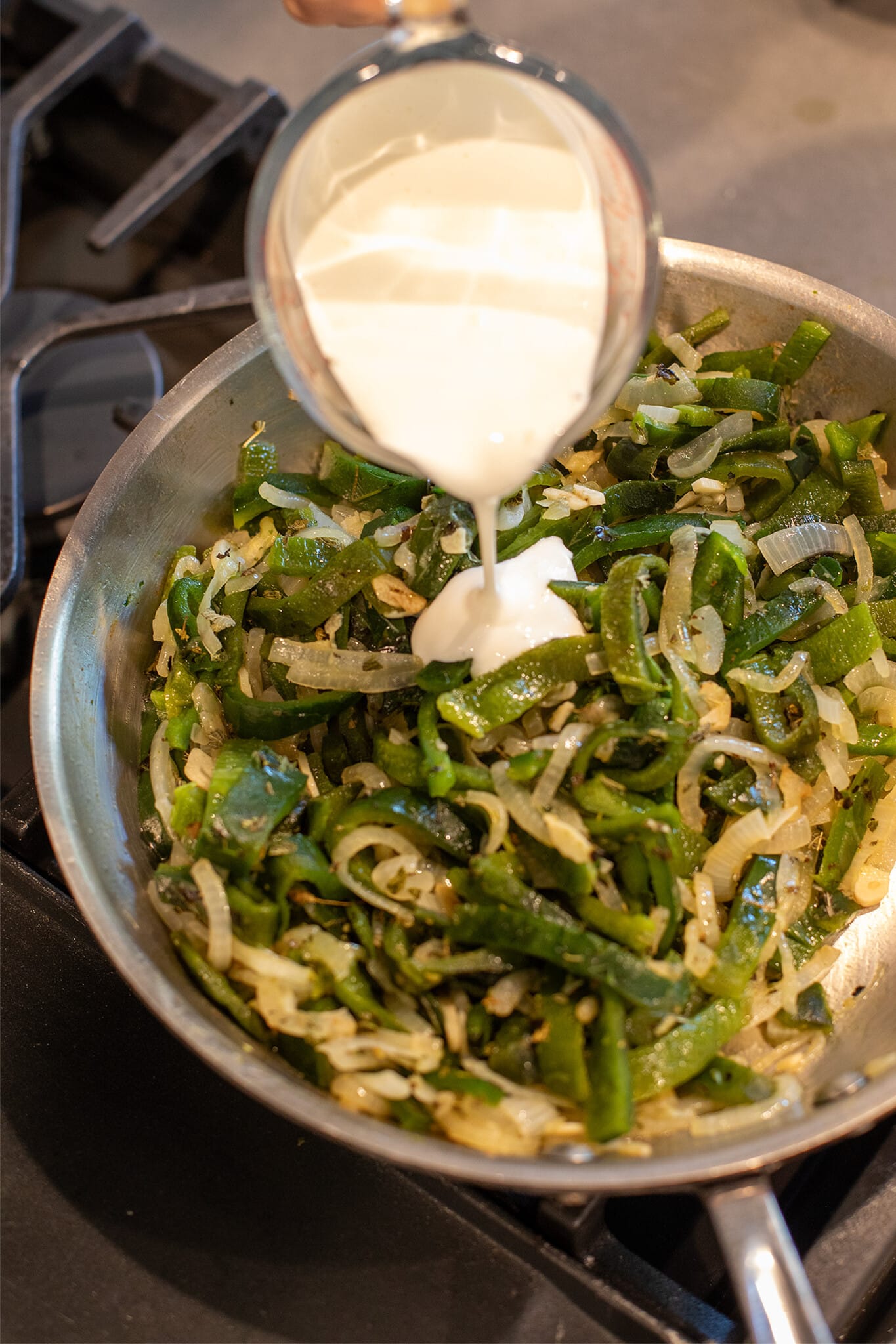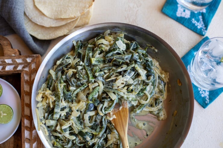 - Make the rajas: Char poblano peppers over direct heat on an outdoor grill, grill pan, or cast iron skillet. Peel, seed, and slice into strips. Sauté onion and garlic in a bit of oil until golden, then add the poblanos, oregano, broth, and Real California crema. Taste for spice level. Know that poblanos vary greatly in heat, and add more crema if they’re too spicy.