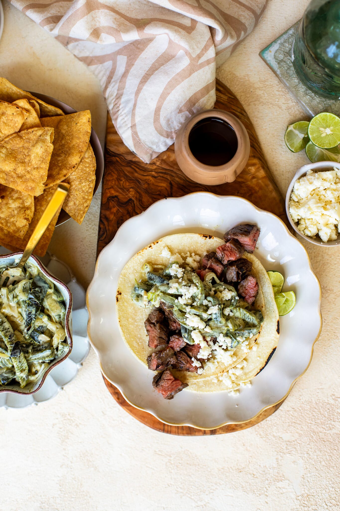 - Cut the meat against the grain into slices and then into large cubes. Season the cubed steak with salt and a squeeze of one lime. To make the steak tacos, place the cubedmeat in a warmed corn tortilla, then top with the cubed steak, the creamy rajas, and crumbled cheese. Serve, if desired, with additional lime wedges.