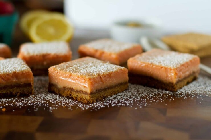 Start by pressing the pistachio graham cracker crust into a parchment-lined pan and bake until lightly golden. While it cools, blend the strawberries into a smooth purée and whisk with lemon juice, eggs, honey, sugar, and vanilla to create the creamy filling. Pour over the crust and bake until set—then chill until firm before slicing your strawberry lemon bars into squares.